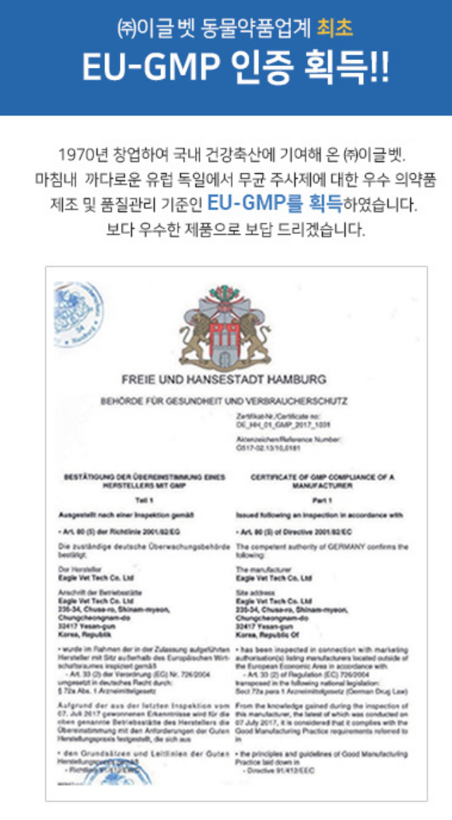 이글벳은 사실 국내 시장보다 해외 시장 공략을 더 적극적으로 추진해 왔습니다. 이는 이글벳 홈페이지에서 확인할 수 있습니다. 유럽의 EU-GMP(우수 의약품 제조 관리 기준) 승인을 이끌어내는 결과를 이뤄냈다는 발표인데요.